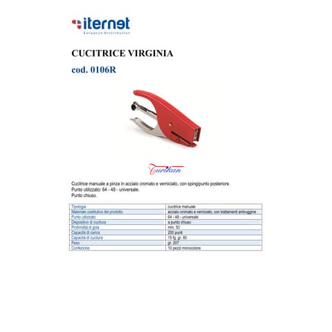 Cucitrice manuale a pinza in acciaio cromato e verniciato, con spingipunto posteriore. Punto utilizzato: 64 - 48 – universale. Punto chiuso e punto aperto. Capacità di carica 150 punti.