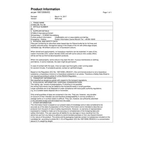 - Altre caratteristiche: ad alta intensità di colore - per linee forti e superfici opache. Elevata brillantezza e luminosità. Può essere conservato aperto fino a 24 ore. Il robusto puntale assicura un trasferimento uniforme dell'inchiostro. Tappo ventilato - può essere fissato all'estremità del perno